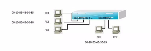 假設主機pc1向主機pc7發送一個數據幀,該數據幀被送到交換機后,交換機首先查MAC地址表,發現主機pc7連接在E0/24接口上,就將數據幀從E0/24接口轉發出去。