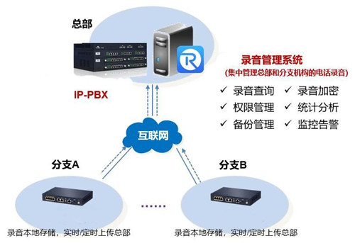 - 分布式錄音,集中式管理:分支機(jī)構(gòu)部署小型IP電話交換機(jī)(IP-PBX),錄音存在設(shè)備內(nèi)置存儲;總部部署大中型IP電話交換機(jī)和錄音管理系統(tǒng),統(tǒng)一管理總部和各分支機(jī)構(gòu)的電話錄音。