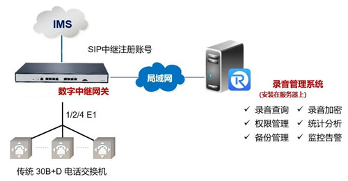 數(shù)字中繼網(wǎng)關(guān)提供1/2/4個E1接口和512個SIP中繼賬號注冊,幫助企業(yè)原有程控電話交換機(jī)接入運(yùn)營商IMS平臺。所有經(jīng)過數(shù)字中繼網(wǎng)關(guān)的通話直接生成錄音,并將錄音文件存儲在服務(wù)器上,通過錄音管理系統(tǒng)對錄音進(jìn)行集中管理。