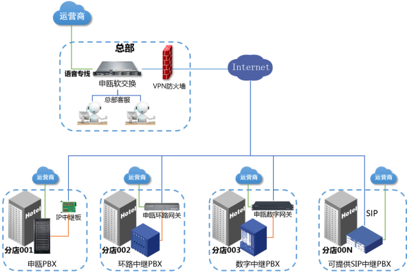 1、在總部中心機房配置一臺申甌SOC1000軟交換設備,外線通過SIP中繼接入運營商平臺;用戶側通過企業局域網接入VPN網絡,并與各門店相連通;