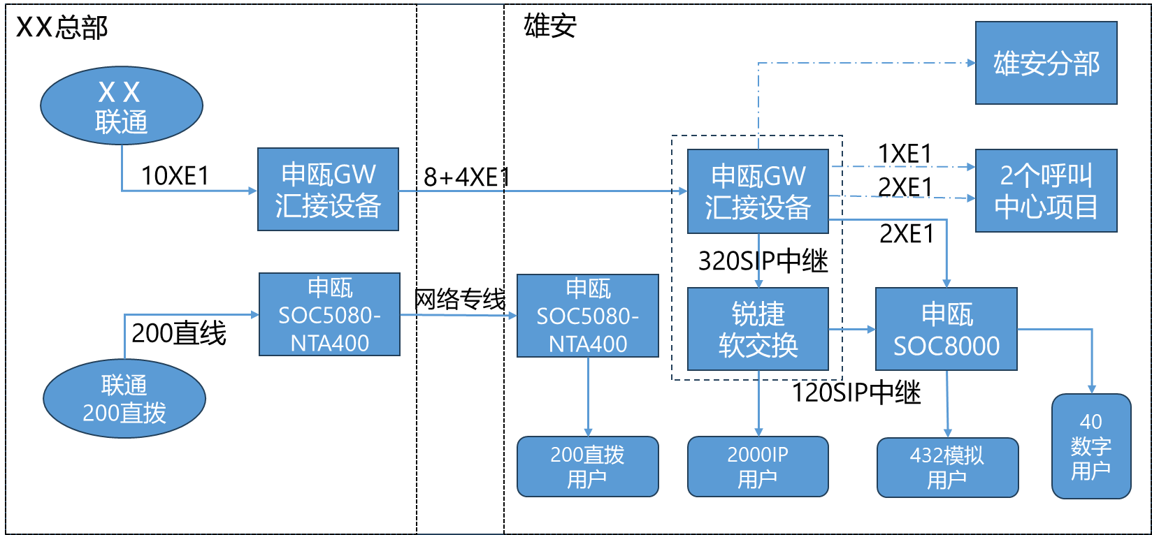 通過(guò)10個(gè)E1鏈路連接X(jué)X聯(lián)通,實(shí)現(xiàn)PSTN網(wǎng)絡(luò)與雄安匯接并與IP網(wǎng)絡(luò)的互通;