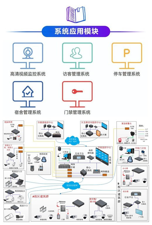 智慧校園的建設,絕不應該是對各個子系統進行簡單堆砌,而是在滿足各子系統功能的基礎上,尋求內部各子系統之間、與外部其它智能化系統之間的完美結合。系統主要依托于綜合管理平臺,來實現對視頻監控系統、入侵報警系統、門禁系統及校園停車場管理等各子系統的綜合管理和控制。